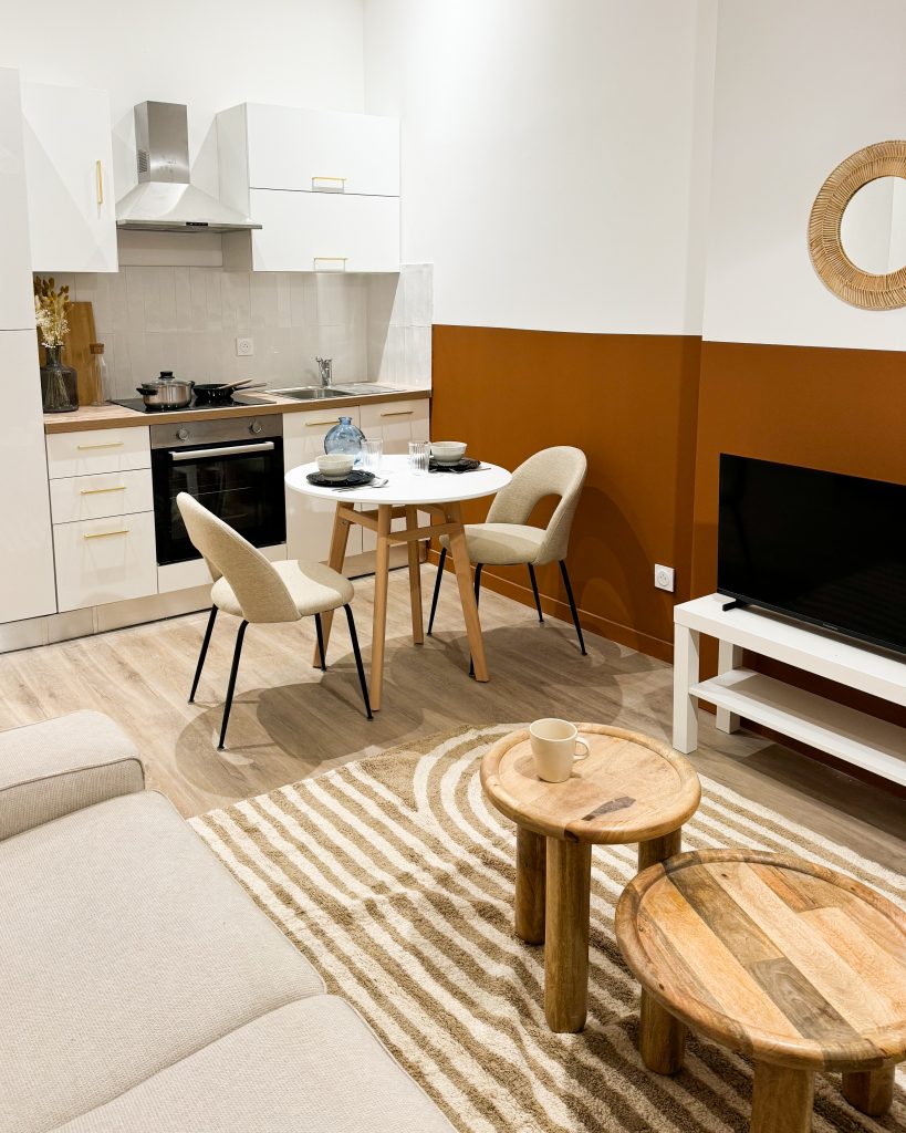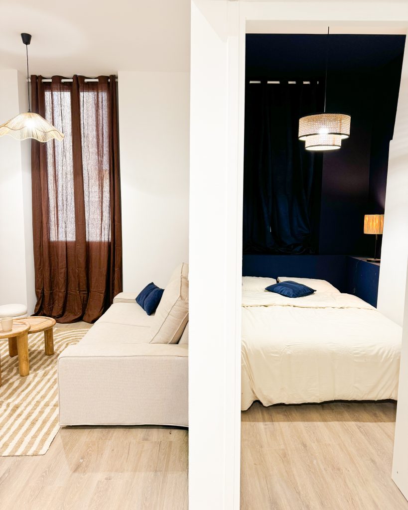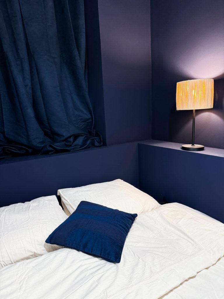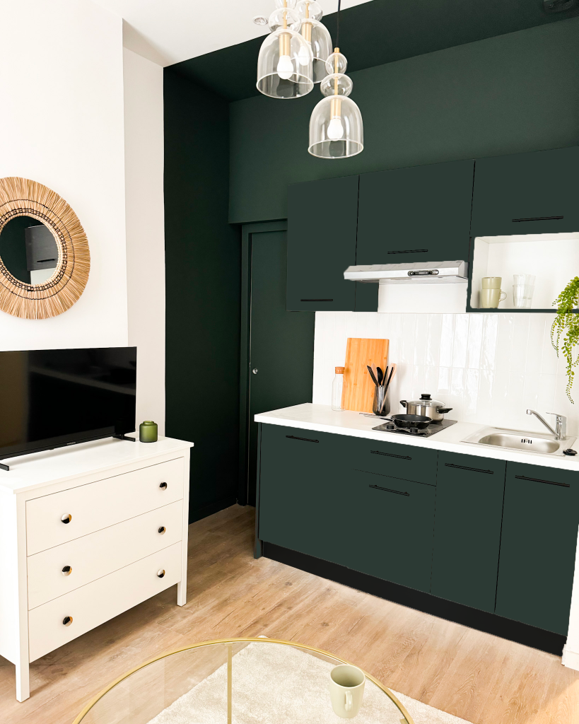 Un studio avec sa cuisine verte, fondue dans le mur de la même teinte. Et un T2 avec sa chambre cocooning et enveloppante grâce à cette peinture bleu nuit recouvrant les murs et plafond.
