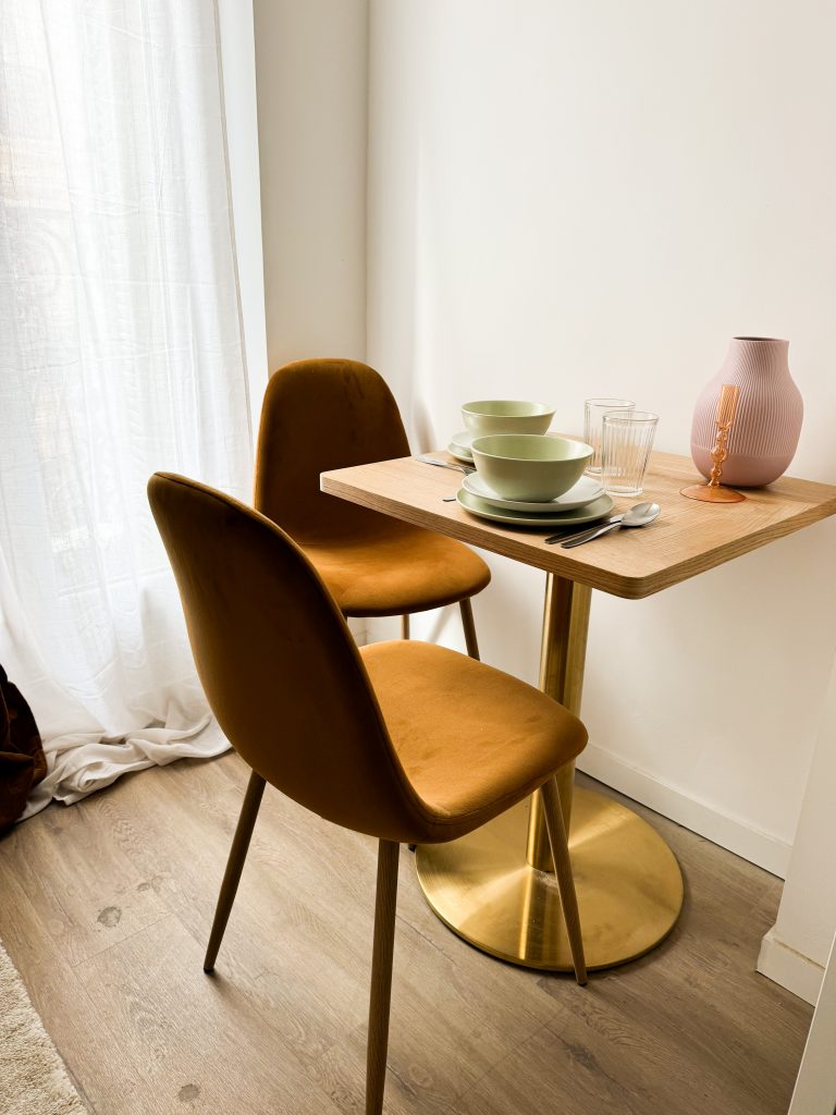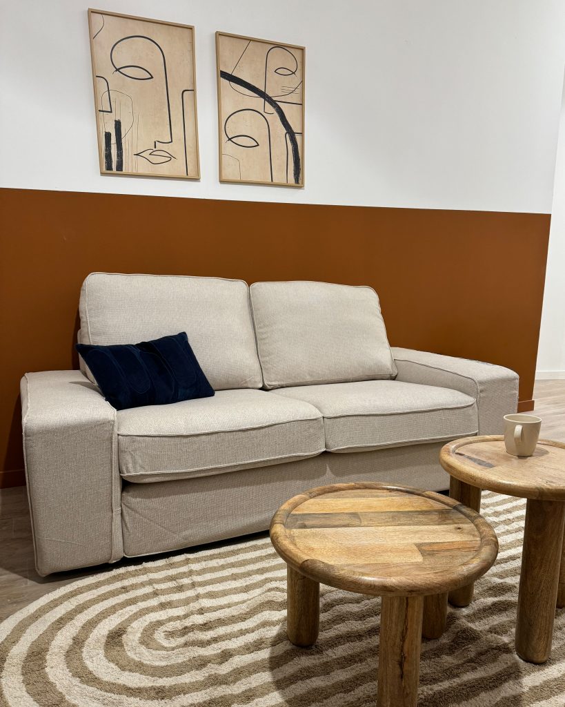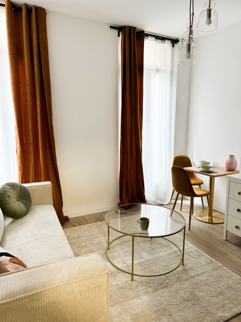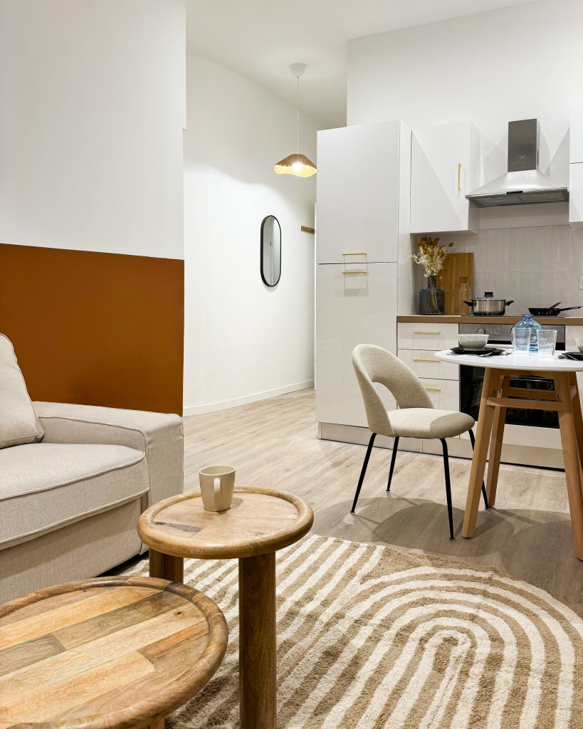 Un studio avec sa cuisine verte, fondue dans le mur de la même teinte. Et un T2 avec sa chambre cocooning et enveloppante grâce à cette peinture bleu nuit recouvrant les murs et plafond.