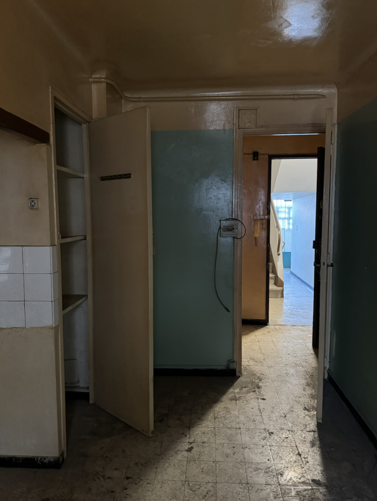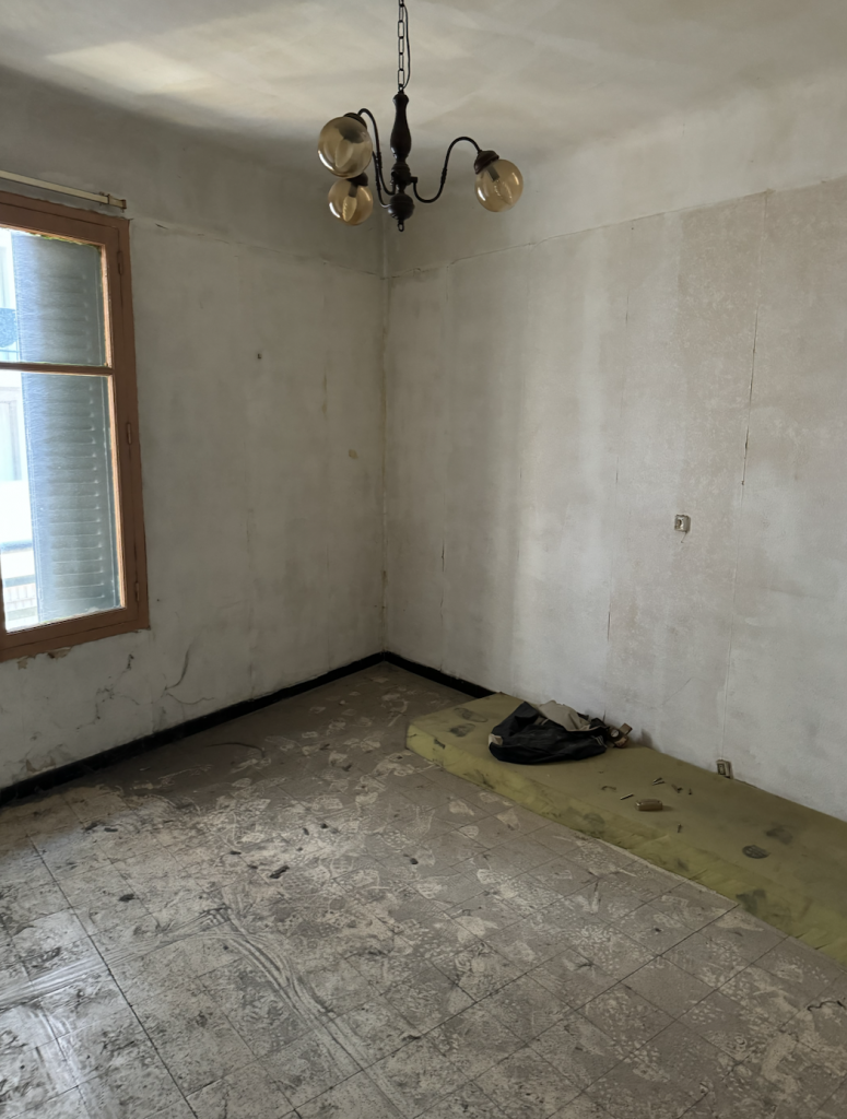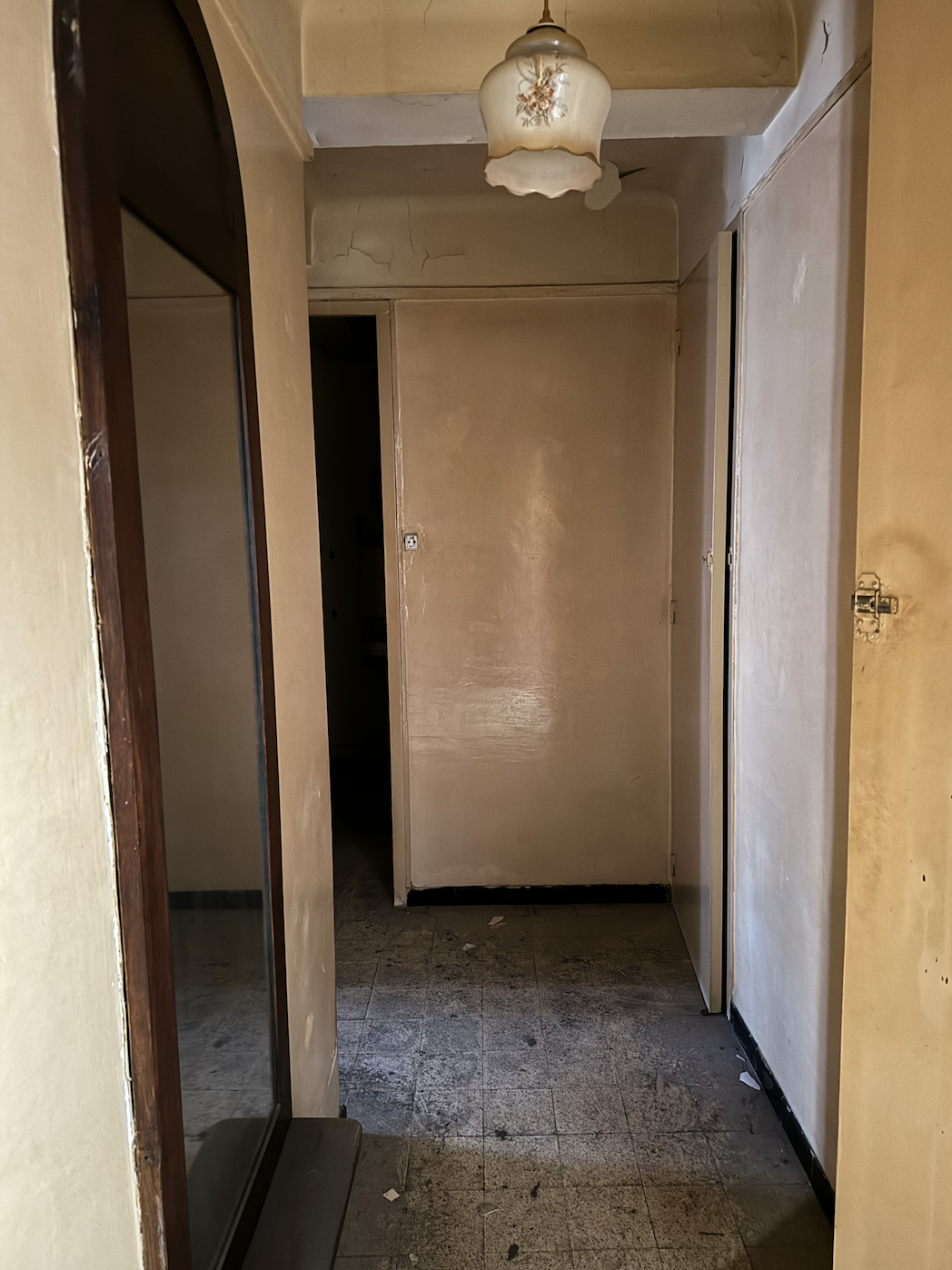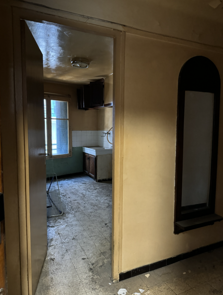 Un appartement de 30 m2, anciennement squatté, délabré et sale. Un couloir de plusieurs m2 est totalement inutilisé et sombre.